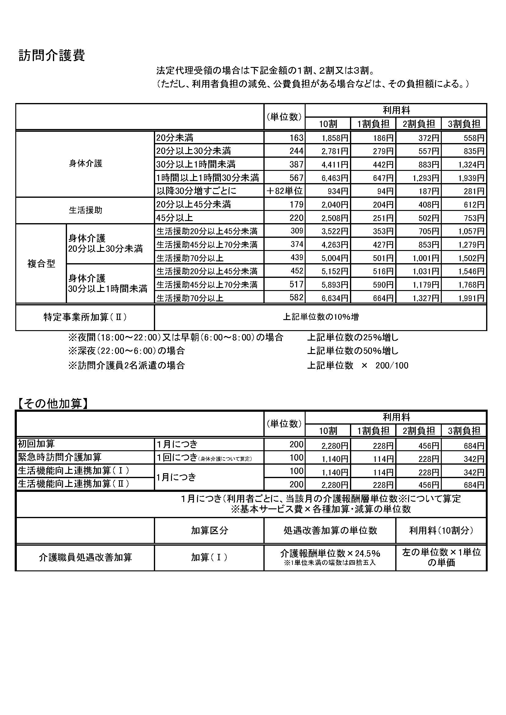 指定訪問介護の提供方法及び内容は次のとおりとし、指定訪問介護を提供した場合の利用料の額は、別紙料金表によるものとし、当該指定訪問介護が法定代理受領サービスである時はその1割、2割又は3割の額とする。